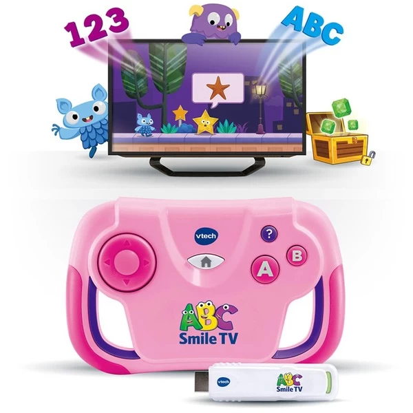 Bereit für ein spaßiges Lernabenteuer? Mit ABC Smile TV gehen Kinder ab 3 Jahren auf Entdeckungsreise. Die Schlüssel des Schlaubeerschlosses wurden von Kobolden gestohlen. Nun gilt es, die Welten Buchstabenland, Zahlingen, Farbhausen und Formenstadt im Schlaubeerkönigreich zu bereisen und dabei Zahlen, Buchstaben, Formen und Farben kennenzulernen. Dabei treffen die kleinen Entdecker immer wieder auf liebevoll gestaltete Figuren. Diese TV-Lernkonsole, die aus einem Controller und einem an einen Fernseher anzuschließenden HDMI-Stick besteht, bietet damit stundenlangen Spielspaß voller Überraschungen und spannender Lerninhalte. Art.-Nr.: 1764204