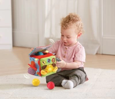Der spannende Kuschelwürfel von vtech unterhält die Kleinen mit sechs Seiten voller unterschiedlicher Gegenstände. Kuschelwürfel 1-2-3 von vtech 6 Seiten mit verschiedenen Spielelementen aufleuchtender Welpe singt, spricht und spielt Melodien reagiert auf Bewegungen mit lustigen Geräuschen inkl. 3 weichen Bällen mit 3 gesungenen Liedern und 15 Kindermelodien Lautstärkeregler, kindersicheres Batteriefach, Abschaltautomatik Demobatterien (2xAAA) im Lieferumfang enthalten ab 3 Monaten Der Kuschelwürfel lädt die Kleinen ab drei Monaten zum Entdecken, Lernen und Spielen ein. Sechs spannende Seiten mit verschiedenen Oberflächen regen den Tastsinn an, der aufleuchtende Hund singt, spricht und spielt tolle Melodien. Der Würfel reagiert zudem auf Bewegungen mit lustigen Geräuschen – das fördert das Gehör und regt die Neugier der Kleinen an. Die drei mitgelieferten weichen Bälle können in den Würfel geworfen werden – wer trifft am besten? Der Würfel kommt mit insgesamt drei gesungenen Liedern und 15 Kindermelodien – so ist echter Spiel- und Singspaß vorprogrammiert. Praktisch: Der Kuschelwürfel kommt mit einem kindersicheren Batteriefach mit Demobatterien, einem Lautstärkeregler und einer Abschaltautomatik.
