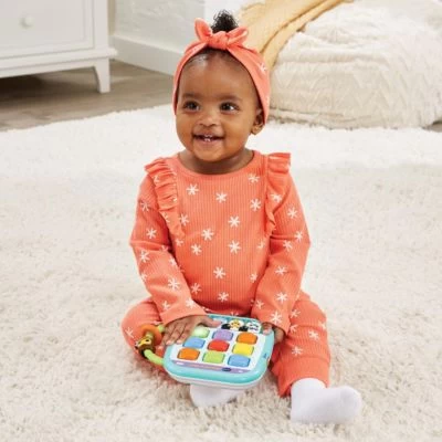 Babys kunterbuntes Pop-It-Tablet von Vtech verspricht musikalischen Spielspaß und schult nebenbei die Sinne des Babys! Das Tablet ist mit einem praktischen Tragegriff und Rasselelementen ausgestattet. Die neun leuchtenden Tasten mit verschiedenen Reliefmustern regen den Tastsinn des Babys an und stimulieren die visuelle Wahrnehmung. Werden die Tasten gedrückt, löst dies lustige Sätze und Musik aus, und die Kinder lernen die ersten Formen und Farben kennen. Die vier Klaviertasten lösen Musik und lustige Sätze zu den abgebildeten Tieren aus (Zebra, Giraffe, Nilpferd und Tiger).