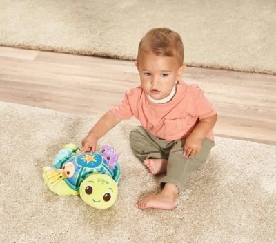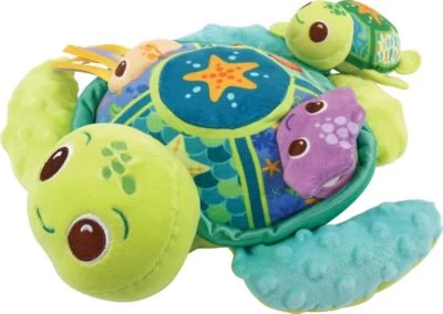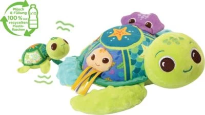 Mama Meeresschildkröte ist ein interaktives Plüschtier, das kleinen Kindern jede Menge Freude bereitet. Beim Drücken auf eine der Tasten an ihrem Panzer werden niedliche Sätze, Geräusche und Musik ausgelöst. Drückt man auf den Seestern am Panzer der Schildkröte, ertönt ein lustiges Quietschgeräusch. Mit diesen und weiteren tollen Funktionen begeistert die süße Schildkröte Groß und Klein!