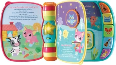 Dieses farbenfrohe Liederbüchlein aus dem Hause Vtech sorgt für besonders viel Abwechslung! Auf sechs Seiten befinden sich jede Menge Liedtexte, Bilder, bewegliche Elemente und vieles mehr. Es gibt fünf verschiedene Instrument-Tasten, sechs gesungene Lieder, über dreißig Kindermelodien und weitere Geräuscheffekte. Mit diesem tollen Büchlein macht Lernen großen Spaß!