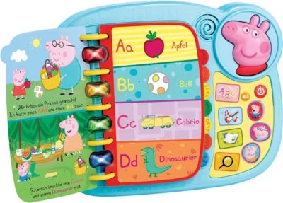 Spielzeug oder Buch? Peppas ABC-Buch von vtech überzeugt als gelungene Kombination mit fröhlichen Sound-Effekten. interaktives Buch von vtech 14 Seiten 4 Spielmodi: Alphabet, Geschichte, Buchstaben und Gegenstände finden, Musik Abschaltautomatik Sprache: Deutsch ab 2 Jahren aus Kunststoff und Pappe Auf den 14 farbenfroh gestalteten Seiten des ABC-Buchs von vtech gibt es eine Menge zu entdecken. Im niedlichen Peppa-Wutz-Design lädt das interaktive Spielzeug Kinder ab zwei Jahren zur ausgiebigen Beschäftigung ein. Die Kleinen können die vier leuchtenden Tasten des Spielzeugs oder die Peppa-Figur drücken, um Sound-Effekte zu aktivieren. Die Originalstimmen von Peppa, Mama Wutz, Papa Wutz und Schorsch bringen jede Menge Spaß ins Kinderzimmer. Nach Lust und Laune kann der Nachwuchs das Alphabet kennenlernen, Geschichten lauschen oder Buchstaben und Gegenstände suchen. Auch Musik steht ihm zur Verfügung. Hinweis Zwei Demobatterien AA sind im Lieferumfang enthalten.