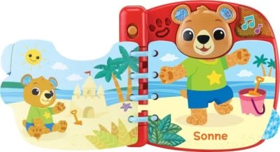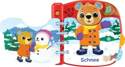 Das Zieh-mich-an-Bärchenbuch von Vtech ist ein interaktives Buch, mit dem das Kind lernt, sich passend zu verschiedenen Wetterbedingungen anzuziehen. Liebevoll gestaltetes Bärchenbuch mit 6 interaktiven Seiten, das dem Kind beibringt, sich passend zum Wetter anzuziehen. Durch Umblättern der Seiten zieht man das Bärchen je nach abgebildeter Wetterlage anders an, während passende Sätze und Geräusche zu Wetter und Kleidung abgespielt werden. Die Bärentaste löst lustige Sätze, Geräusche und Musik aus. Die leuchtende LED an der Oberseite des Buches sorgt für einen weiteren tollen Effekt!