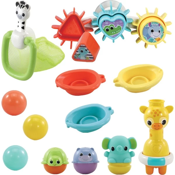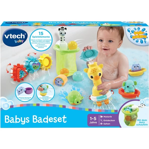 Ein tolles Set für jede Menge Spaß in der Badewanne. Viele verschiedene Teile bringen dabei jede Menge Abwechslung: Wird Wasser in die Giraffe gegossen, so wird der Schwimmring zu einem kleinen Springbrunnen. Wird der kleine Elefant mit Wasser gefüllt und gedrückt, so spritzt Wasser aus seinem Rüssel. Mit den 3 Tier-Tassen kann nach Herzenslust geschöpft und gegossen werden. Die Formenklötzchen zum Aufstecken und die Zahlenräder schulen die Feinmotorik. Mit dabei ist auch ein Netz, das per Saugnapf an der Wannenwand befestigt werden kann. Drei Bälle können ins Netz geworfen werden, zusätzlich kann es als Aufbewahrungsmöglichkeit dienen.Art.-Nr.: 100004672