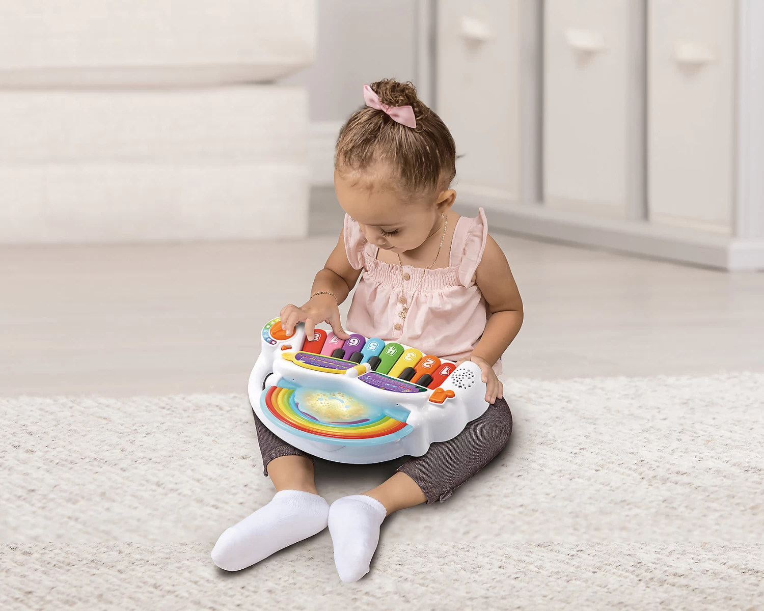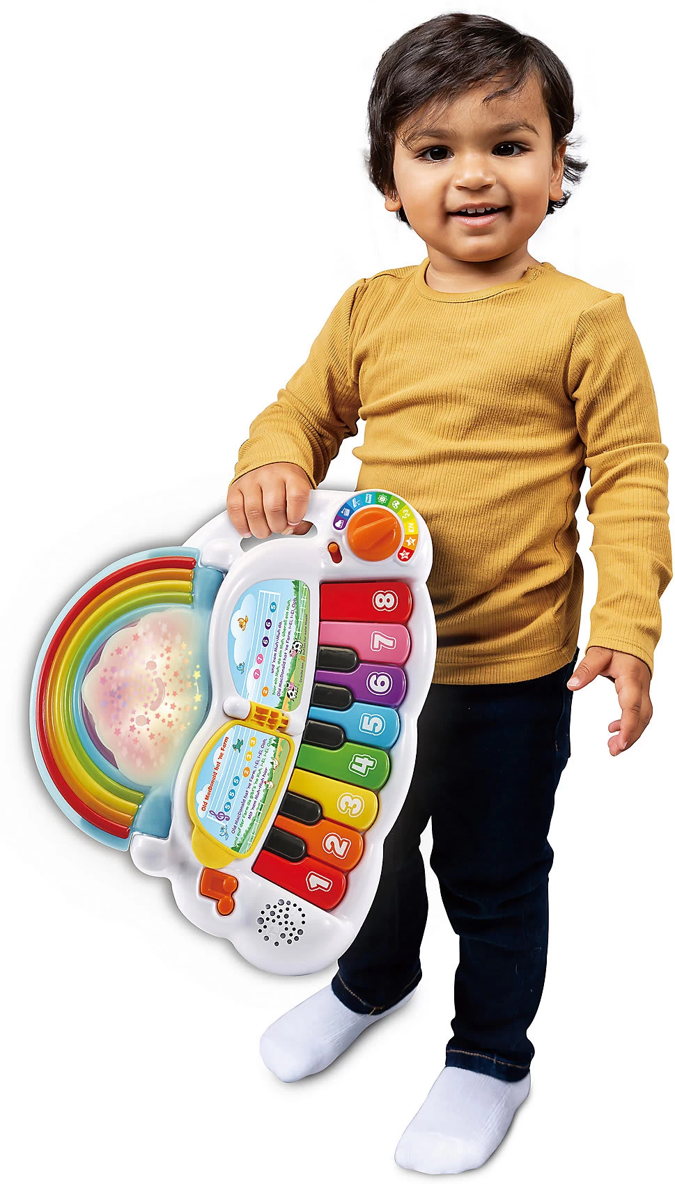 Das bunt leuchtende Keyboard von Vtech animiert die Kleinen ab sechs Monaten zum Musizieren und Lernen! Babys Regenbogen-Keyboard von Vtech inkl. 4-seitiges Notenbuch 8 bunte Klaviertasten, leuchtende Wolke (Position verstellbar), Drehschalter 4 Spielmodi: freies Spiel, Musikmodus, Farbmodus, Zahlenmodus zusätzlicher Englisch-Modus für erste Zahlen 3 Lieder, 17 Melodien, gesungene Wörter und Geräusche Lautstärkeregler, kindersicheres Batteriefach und Abschaltautomatik deutsch- und englischsprachig inkl. Demobatterien (2xAA) ab 6 Monaten geeignet Das interaktive Keyboard bietet acht kunterbunte Klaviertasten, mit denen Musik gemacht und Zahlen und Farben entdeckt werden können. Die große Wolke leuchtet passende zu den Klaviertasten und im Rhythmus zur Musik – so ist Spielspaß vorprogrammiert. Mit dem großen Drehschalter kann zwischen sieben verschiedenen Instrumenten gewählt werden. Damit es nie langweilig wird, ist das Keyboard mit vier Spielmodi ausgestattet: freies Spiel, Musik-, Farb- und Zahlenmodus. Mit dem zusätzlichen Englisch-Modus können die Kleinen spielerisch die ersten Zahlen lernen. Insgesamt bietet das Keyboard drei Lieder, siebzehn Melodien und zahlreiche gesungene Wörter und Geräusche. Das vierseitige Notenbuch ist im Lieferumfang inbegriffen und stellt zwei bekannte Lieder zum Nachspielen zur Verfügung.