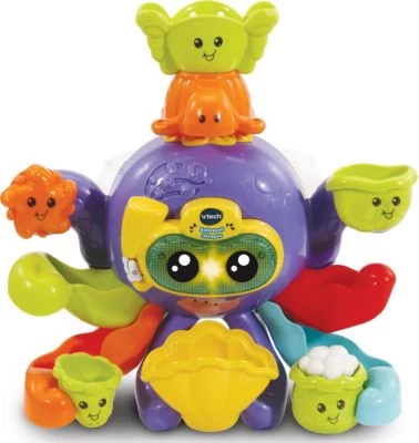 Plitschplatsch, Badespaß! Der niedliche interaktive Oktopus von Vtech verfügt über zahlreiche bewegliche Elemente für lustigen Badespaß. Leert man Wasser in die Arme oder in den Babyoktopus auf dem Kopf des großen Oktopus, sorgt das Wasser für tolle Bewegungen und Effekte. Beispielsweise dreht sich der Seestern, wenn er durch das Wasser in Bewegung gesetzt wird. Die Tentakel-Wasserrutschen haben lustige Löcher. Die große Muschel wird über die Löcher im Oktopusmund mit Wasser gefüllt und klappt hervor. Außerdem gibt es einen Meeresschnecken-Eimer, der zur Seite kippt, wenn er mit Wasser gefüllt wird. Auch ein kleiner Muscheleimer mit Löchern sowie ein Eimer mit aufsteigendem Seegras, wenn er mit Wasser gefüllt wird, sind dabei. Wird die leuchtende Gesichtstaste gedrückt oder Wasser in den Oktopus geleert, werden lustige Sätze, Musik und Geräusche ausgelöst. Zwei Gefäße in Tierform erleichtern das Wasserschöpfen. Die Saugnäpfe an der Rückseite ermöglichen es, den Oktopus an der Dusche oder Badewanne zu befestigen.