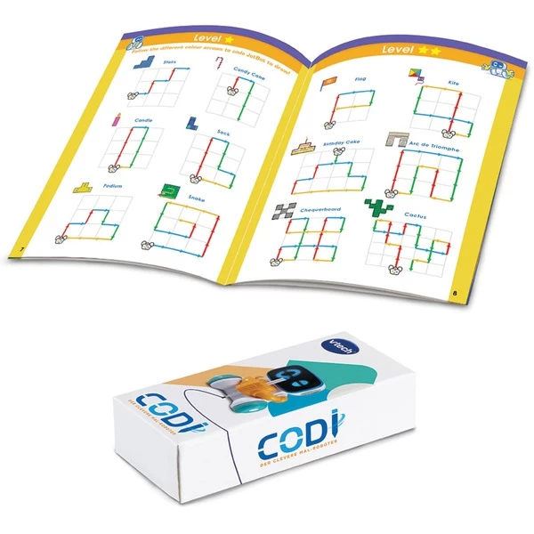 Mit dem niedlichen Roboter können Kinder ab 3 Jahren codieren, zeichnen und lernen. Er zeichnet verschiedene vorinstallierte oder selbstprogrammierte Motive und animiert zum Mit- und Weitermalen. Mit dabei 15 doppelseitige Chipkarten zum Buchstaben lernen und Zeichnen, ein Heftchen mit 40 Codierbeispielen und ein Stift. Codi erkennt die Größe des Papiers, kann einen Stift mit 7-10 cm Durchmesser halten und reagiert auf Einsetzen der Chipkarten sowie auf Drücken der Steuerungstasten. Es gibt Drei Spielfunktionen zum Zeichnen und Codieren. Wird im Zeichen-Modus eine Chipkarte in Codis Rucksack gesteckt, zeichnet er die entsprechende Form und lädt zum Mit- oder Weiterzeichnen ein. Beim freien Zeichnen wählt Codi zufällig eins von 99 Motiven oder Spielen aus. Beim Zeichnen wird Wissenswertes vermittelt und es werden passende Geräuscheffekte ausgelöst. Im Codier-Modus können einfache Zeichnung durch Drücken der Steuerungstasten programmiert werden. Durch Drücken von geheimen Tastenkombinationen überrascht Codi mit besonderen Figuren. Durch die vier LEDs im Gesicht zeigt Codi verschiedene Gesichtsausdrücke.