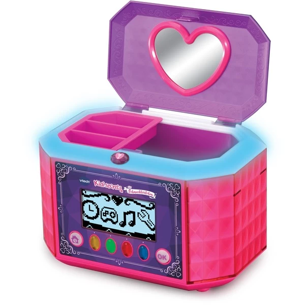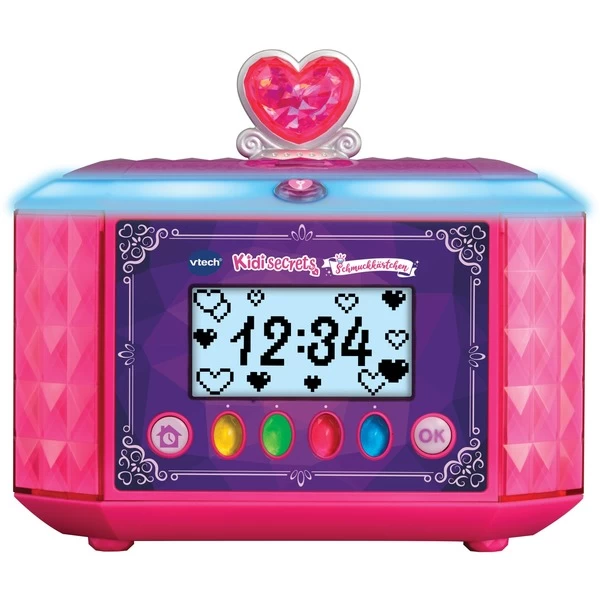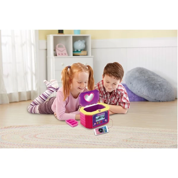 In dem 6-in-1 Schmuckkästchen alle Geheimnisse sicher aufbewahren! In dem Schmuckkästchen können alle Schätze mit einem Zahlencode geschützt werden. Durch Eingabe des Zahlencodes öffnet es sich automatisch und wird dabei magisch erleuchtet. Mit Weckfunktion und Leuchteffekten. In verschiedenen Farben leuchtendes Lichtband am Deckel des Kästchens. Die funkelnden Lichteffekte variieren je nach Aktivität. Es kann ein externer Musikplayer angeschlossen werden, um die eigenen Lieblingslieder zu hören. Mit interaktivem LCD-Bildschirm. 10 Spiele, 4 Musikaktivitäten. Herausnehmbares Fach und Stauraum. Integrierter Spiegel am Deckel der Truhe.Art.-Nr.: 1626007