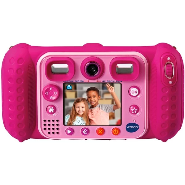Die VTech KidiZoom Duo Pro ist eine robuste Digitalkamera mit integriertem Musik- Player, Film- und Panorama-Funktion, Bildbearbeitung und Spielen. Sie hat eine Vorder- und Rückkamera für tolle Bilder und Videos (5 MP, Fotos auf 6 MP extrapoliert.). Vier Kreativ-Apps und Stimmrekorder, darunter die neue Foto-Story-Funktion, mit der Bilder zu einer Story zusammengefügt werden können, und neue Animationsvideo-Funktionen verwandeln die Kamera Gesichter in eine interaktive Comic-Figur. Mit tollen AR-Spielen in der “Erweiterte Realität“ kann man mit lustigen Videofiltern spielen. Mit über 70 Fotoeffekten und zahlreichen Fotorahmen und Stempeln gestaltet sich vor allem die Dual-Kamera-Aufnahme – die gleichzeitige Aufnahme über Vorder- und Rückkamera – zu einem Erlebnis. Mit dem verbesserten Videorekorder werden Animationen per Gesichtserkennung ausgelöst und gesteuert. Er liefert bewegte Bilder mit einer Videoauflösung von 640 x 480 MP. Das 2.4“ LCD-Farbdisplay sowie der große Doppelsucher lassen das Objekt der Fotografie schnell und präzise erfassen. Ein spezieller Elternkontrollbereich ermöglicht Einstellungen für Eltern, die einen Überblick über das Nutzverhalten der Kinder haben wollen. Die KidiZoom Duo Pro ist linkshänderfreundlich: der Auslöser kann wahlweise links oder rechts eingestellt werden. Der 256 MB große interne Speicher ist durch eine optional erhältliche microSD-Karte erweiterbar. Mit USB-Anschluss für die Verbindung zum PC lassen sich Daten von der Kamera zur Archivierung übertragen.Art.-Nr.: 1847267