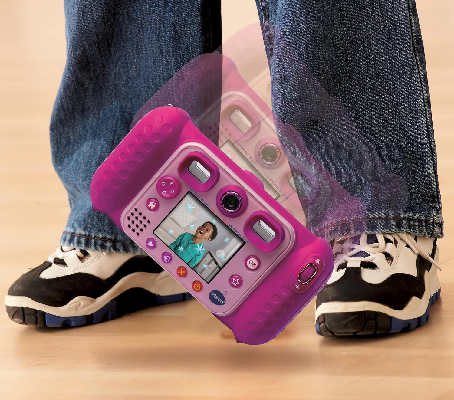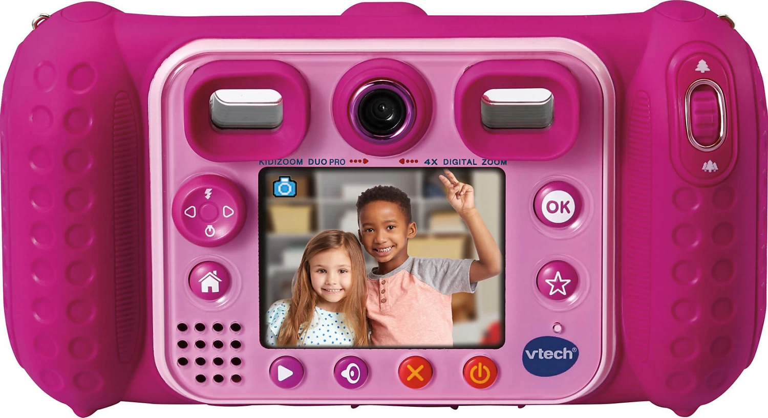 Bitte lächeln! Mit der Vtech KidiZoom Duo Pro können sich auch die Kleinsten schon als echte Profi-Fotografen versuchen. Die kindgerechte Kamera verfügt über einen einfach zu handhabenden Doppelsucher und hat sowohl links als auch rechts einen Auslöser. Mit über siebzig Effekten, Rahmen und Stempeln können geschossene Meisterwerke anschließend ganz nach Belieben bearbeitet werden. Eine Video-Funktion ermöglicht darüber hinaus die Erstellung von Filmen von bis zu zehn Minuten Länge. Der integrierte Speicher kann mittels einer separaten MicroSD-Karte in wenigen Handgriffen erweitert werden.