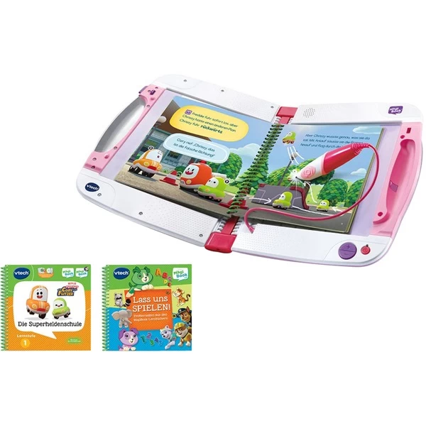 | Inhalt/Ausstattung | Stift mit Audio-Feedback löst Erklärungen, Aufforderungen, Geräusche und Soundeffekte aus, inkl. 2 Lernbüchern (Lernstufe 1 Tut Tut Cory Flitzer – Die Superhelden-Schule + 1 Vorschau-Lernbuch), mit Klick-Vorrichtung für die Lernbücher und integriertem Lautsprecher | ||