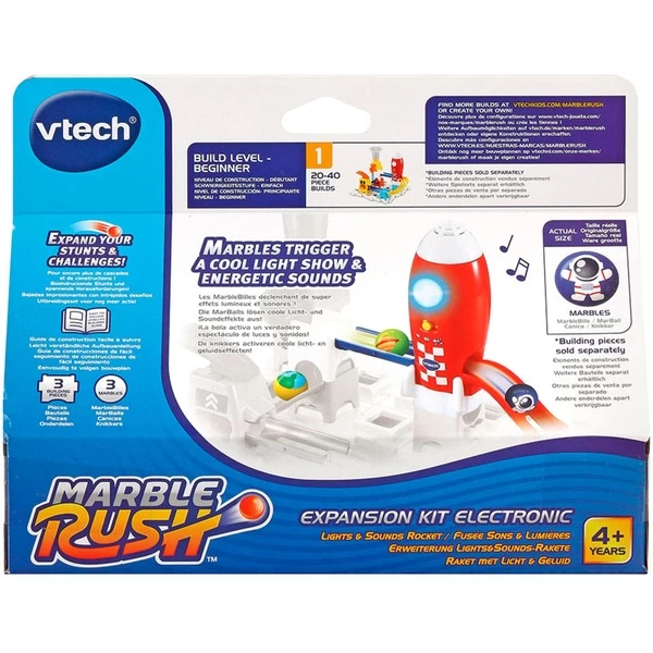 Die Lights&Sounds-Rakete ist ein Erweiterungsset für die VTech-Kugelbahn aus der Serie Marble Rush. Das Set enthält ein elektronisches Sound- und Lichtmodul sowie 3 MarBalls (Kugeln). Die Rakete reagiert mit witzigen Sounds und Lichteffekten darauf, wenn die Kugeln in den Trichter rollen. Außerdem spielt sie coole Musik während des Spielens. Die Erweiterung ist kompatibel mit allen Marble Rush Sets.Art.-Nr.: 1896014