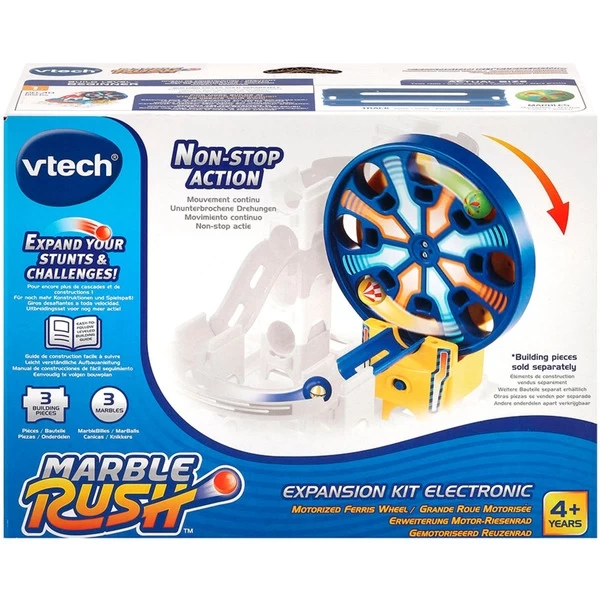 Das Motor-Riesenrad ist ein Erweiterungsset für die VTech-Kugelbahn aus der Serie Marble Rush. Das Set enthält ein sich bewegendes Riesenrad und 3 MarBalls (Kugeln). Das Riesenrad nimmt die Kugeln automatisch auf und befördert sie auf die nächste Ebene. Die Erweiterung ist kompatibel mit allen Marble Rush Sets.Art.-Nr.: 1896013