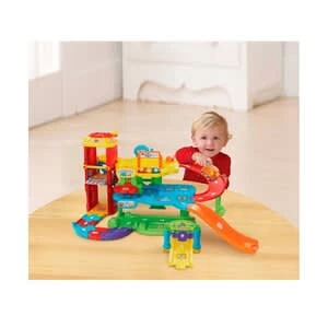 Die interaktive Parkgarage aus der Kollektion Tut Tut Baby Flitzer von vtech bietet kleinen Autofans vielseitigen Spielspaß. Parkgarage mit drei Ebenen inkl. Abschleppwagen Waschstraße, Tankstelle Soundeffekte, Kinderlieder und Melodien (Sprache: Deutsch) Demobatterien sind enthalten ab 12 Monate aus robustem Kunststoff Parkplätze finden, unterwegs tanken oder den Wagen waschen, dies bietet die Parkgarage mit ihren tollen Funktionen. Viele bewegliche Elemente regen schon die Jüngsten zum Drehen oder Drücken der Schranken und Klappen an. Ein Aufzug befördert den Baby Flitzerbus auf das oberste Parkdeck, dort kann er einen Blitzstart hinlegen. Damit es beim Tanken und Parken unterhaltsam zugeht, erkennen magische Sensoren die Fahrzeuge und machen Geräusche oder sprechen Sätze. Hübsche Kinderlieder und Melodien runden die interaktive Spielwelt ab.