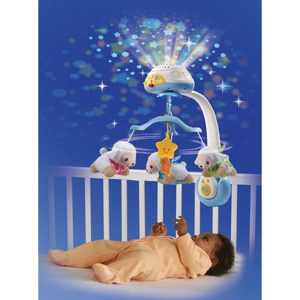 Für besonders süße Träume sorgt das Schäfchen-Mobile! Drei süße, weiche Plüsch-Schäfchen drehen sich im Kreis. Dazu werden Sternenlichter mit bunten Lichteffekten an die Decke projiziert. Vier Schlaflieder und beruhigende Naturgeräusche begleiten Babies sanft in den Schlaf. Der Geräuschsensor lässt die Melodien wieder erklingen, sobald das Baby weint. Durch die Zeitschaltuhr, die auf 15, 30 oder 45 Minuten eingestellt werden kann, und den zwei Lautstärkereglern lässt sich das Schäfchen-Moblie den individuellen Bedürfnissen der Kleinen anpassen. Die Fernbedienung sorgt für Bedienkomfort auch aus der Distanz.