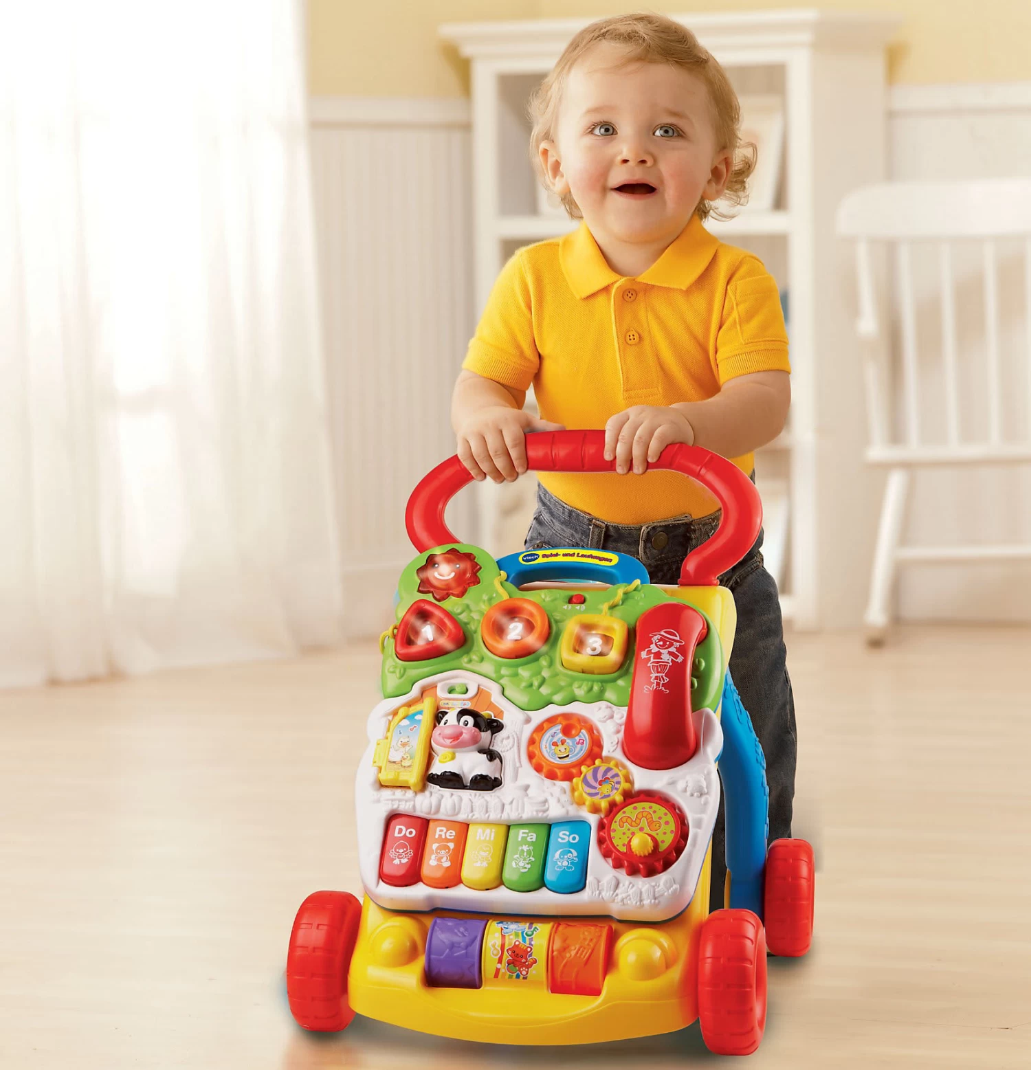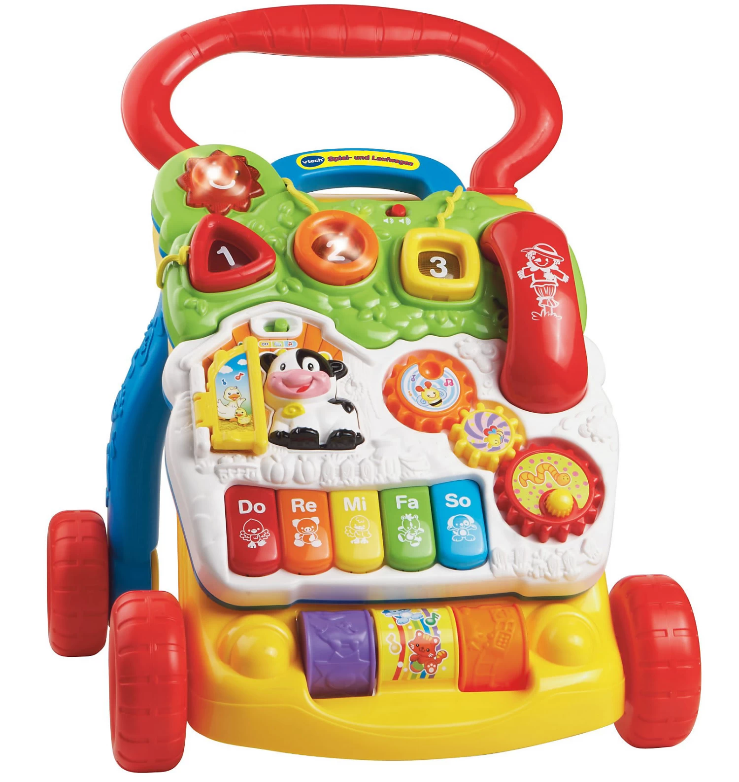 Der kunterbunte Spiel- und Laufwagen in der Farbvariante rot/blau von Vtech Baby hilft Ihrem Baby bei seinen ersten Schritten!