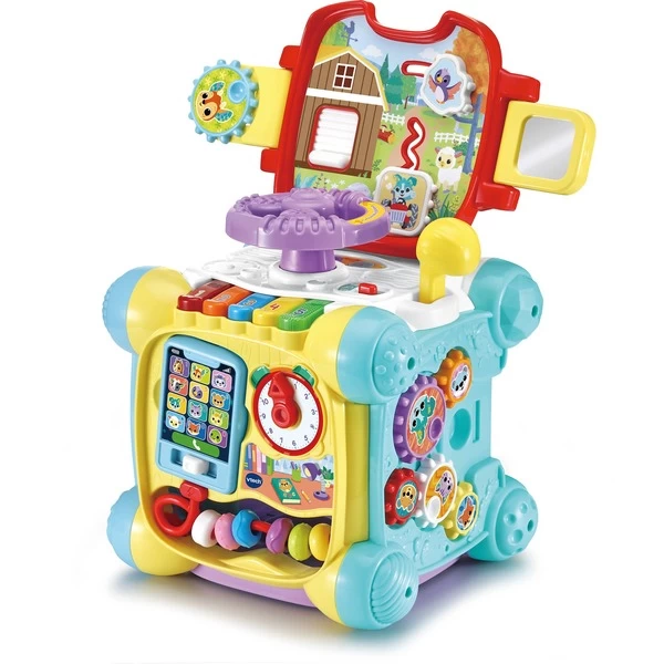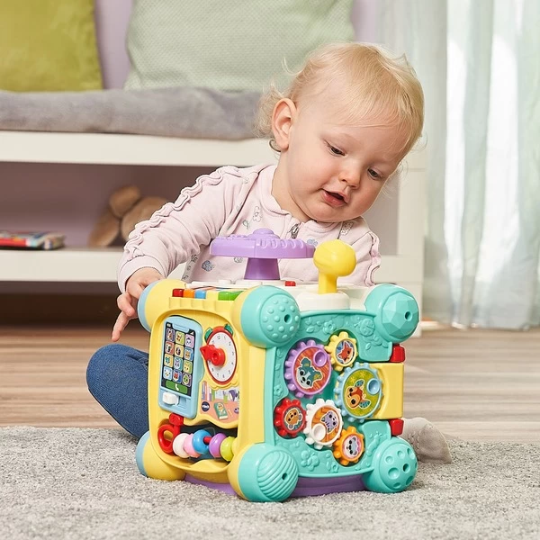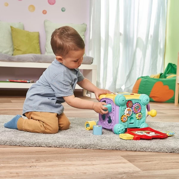 Der Spielspaß-Entdeckerwürfel ist ein bunter Kunststoff-Würfel mit 6 interaktiven Würfelseiten. Er enthält verschiedene bewegliche Elemente für abwechslungsreichen Spielspaß zu den Themen Stadt, Ozean, Wald, Schreibtisch, Autofahren und Formen. Beim Spielen stehen 5 gesungene Lieder und 15 Melodien zum Abspielen bereit. Dieser Würfel ist ein tolles Spielerlebnis für Kinder ab 12 Monaten, das Motorik und Tastsinn fördert. Art.-Nr.: 100004647