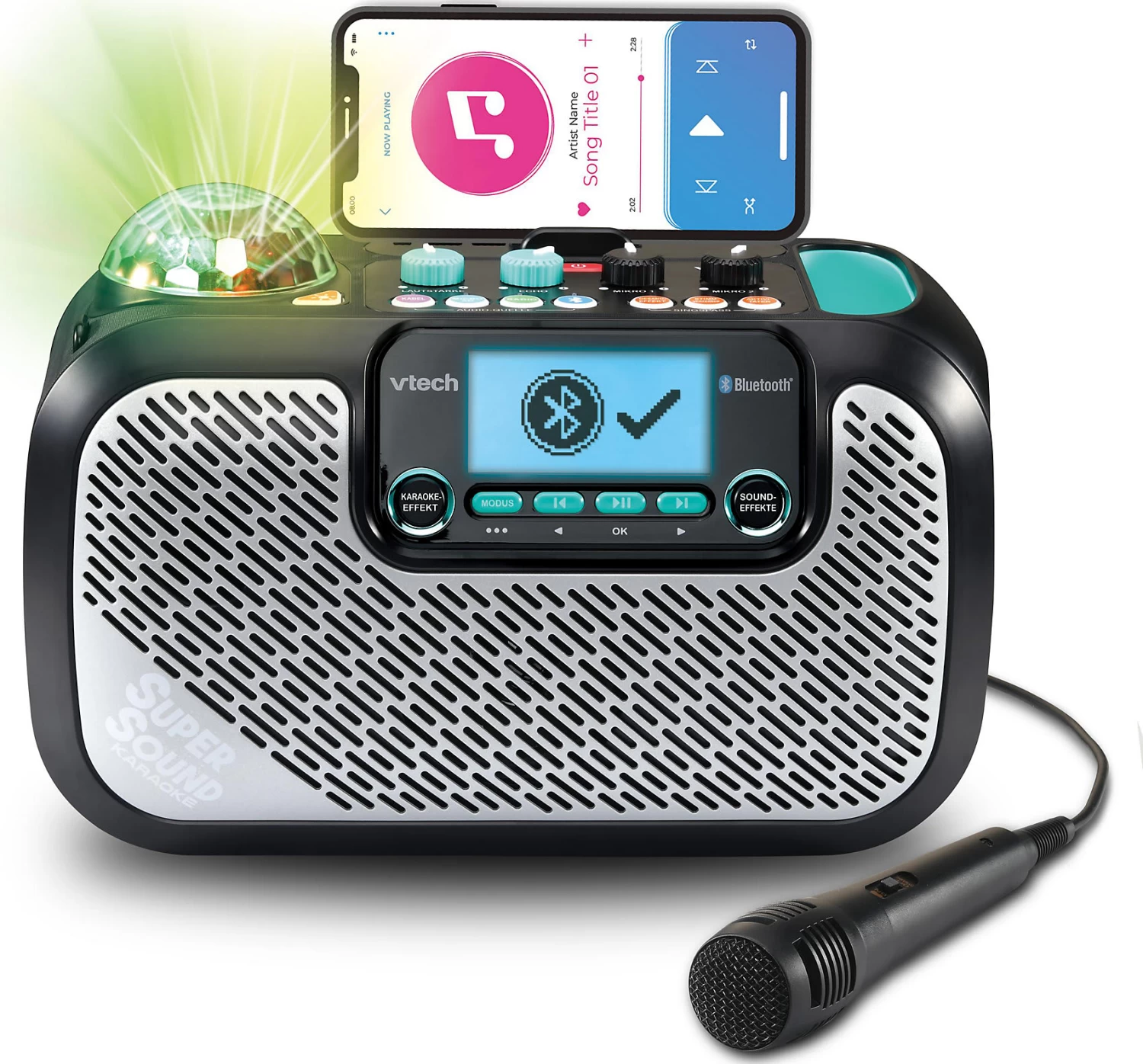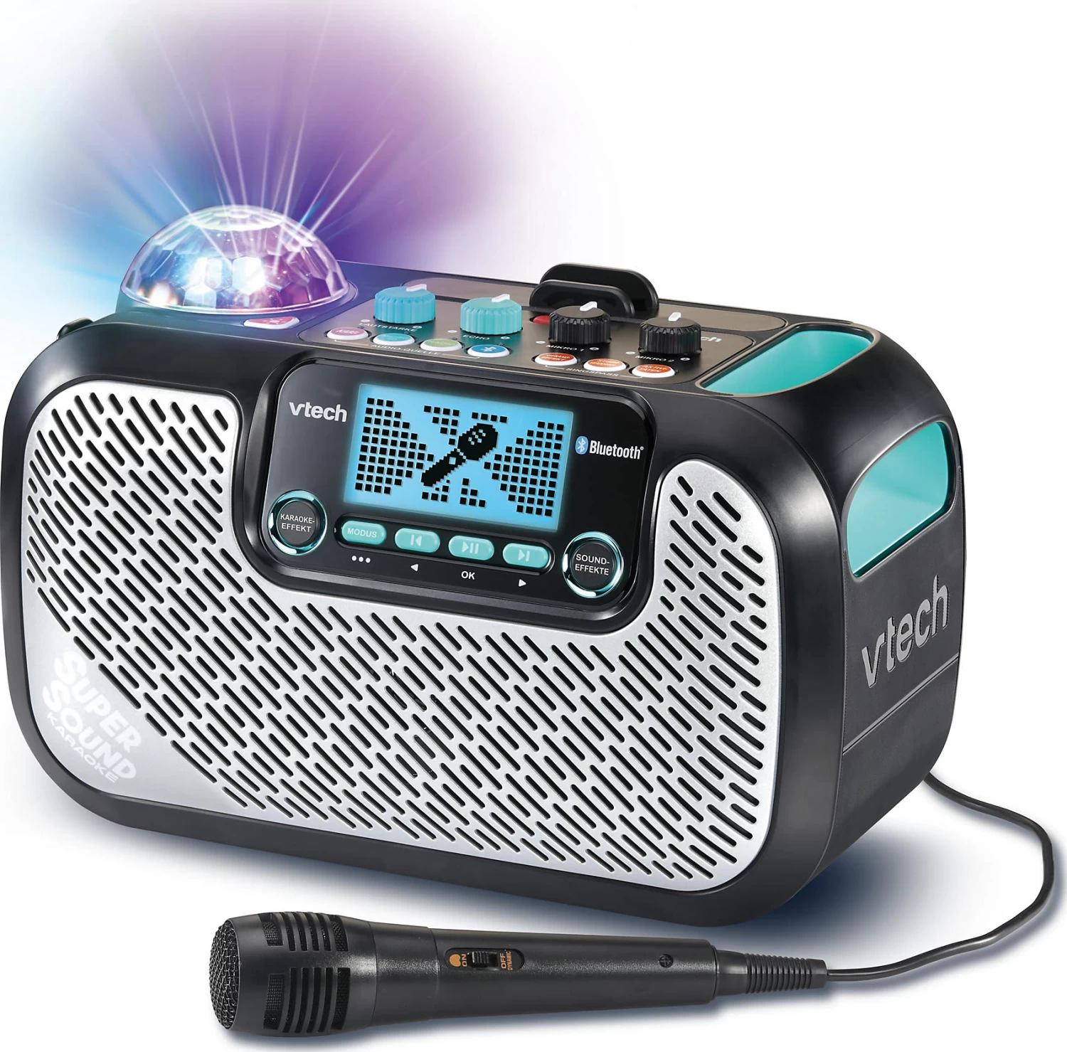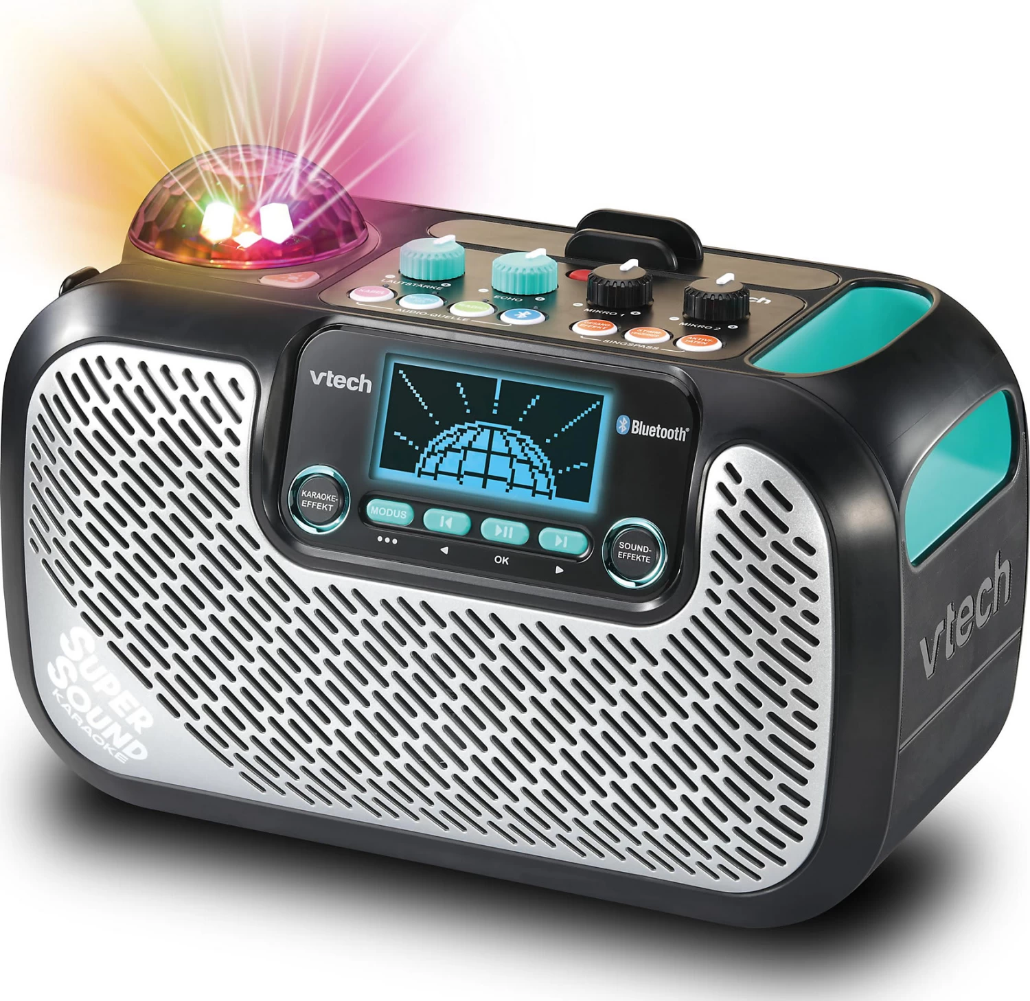 Für alle angehenden Superstars und alle Gesangsfans: Mit dieser coolen Karaoke-Box von Vtech ist für Unterhaltung unterwegs und zuhause gesorgt. Die Box kommt mit tollen Spielen, Gesangs- und Einsingübungen, tollen Soundeffekten und einem Stimmenverzerrer. Mit dem magischen „Karaoke-Effekt“ kann der Gesang aus Liedern entfernt werden und 5 integrierte Melodien laden dazu ein eigene Gesangsstücke zu kreieren. Ein integrierter MP3-Player und das FM-Radio bieten viele Möglichkeiten, die durch die verschiedenen Funktionen (Mobilgeräte via Bluetooth oder Klinkenkabel verbinden oder microSD-Karte einstecken) ergänzt werden können. Das beleuchtete LC-Display und die coolen Lichteffekte sorgen für prima Disco-Stimmung. Und wer im Duett singen mag: ein Steckplatz für ein zweites Mikro (nicht enthalten) ist vorhanden.