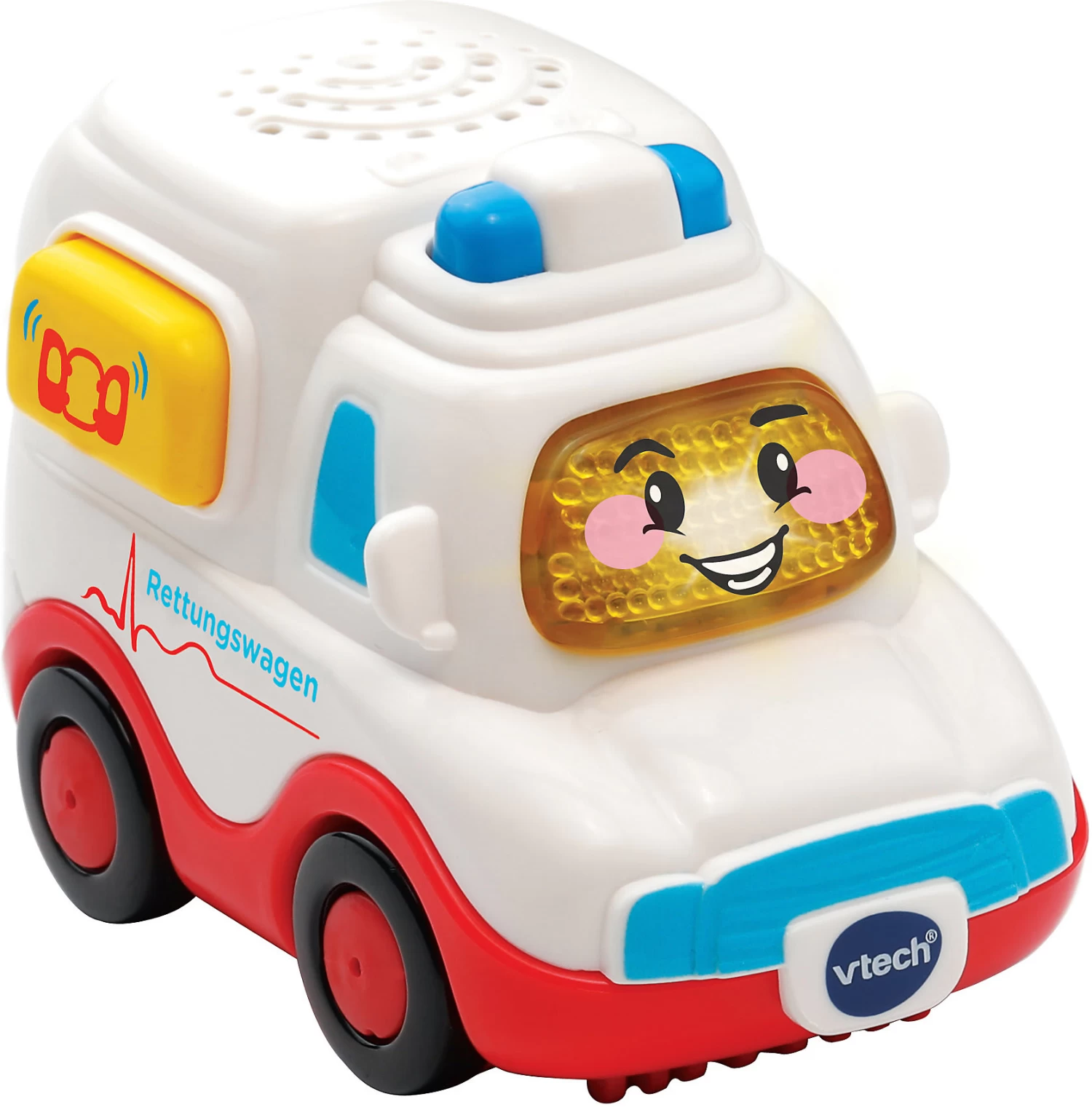 Der robuste kleine Krankenwagen begleitet Ihren kleinen Entdecker beim ersten Rollenspiel. Das Kind wird dazu animiert, den Flitzer durch den Raum zu schieben. Dabei ertönen lustige Geräusche, gesungene Lieder und Sirenengeräusche. Eine blinkende Taste lädt zum weiteren Erkunden des Fahrzeugs ein.
