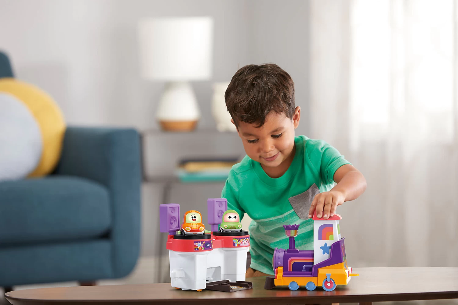Tuk-Tuk, hier kommt der lustige DJ Bahnschiene von VTech! Auch Cory und Chrissy aus der Cory Flitzer-Serie sind mit dabei. Auf den zwei drehbaren Plattentellern können sie Platz nehmen und reagieren mit tollen Licht- und Soundeffekten. Der Anhänger lässt sich auf Wunsch abnehmen. Die aufleuchtende Schornsteintaste an der Lok sorgt für extra Spielspaß!