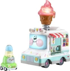 Wer hat Lust auf Eis? Dieser niedliche Tut Tut Cory Flitzer – „Eileen Eiswagen“ von Vtech hat nicht nur Eis dabei, sondern bietet auch noch ein Feuerwerk an Spielemöglichkeiten für die Kleinen! Eileens Eiswagen spielt Melodien und Lieder, macht auf Knopfdruck lustige Geräusche und spricht mit Chrissys stimme aus der beliebten Netflix-Serie „Tut Tut Cory Flitzer“. Das bunte Eis auf Eileens Dach leuchtet, wenn man draufdrückt und ist beweglich. Und was ist das? Die Eis-Theke kann ausgeklappt werden und die Markise auch. Da ist aber einiges los! Und wenn der Eiswagen losfährt?