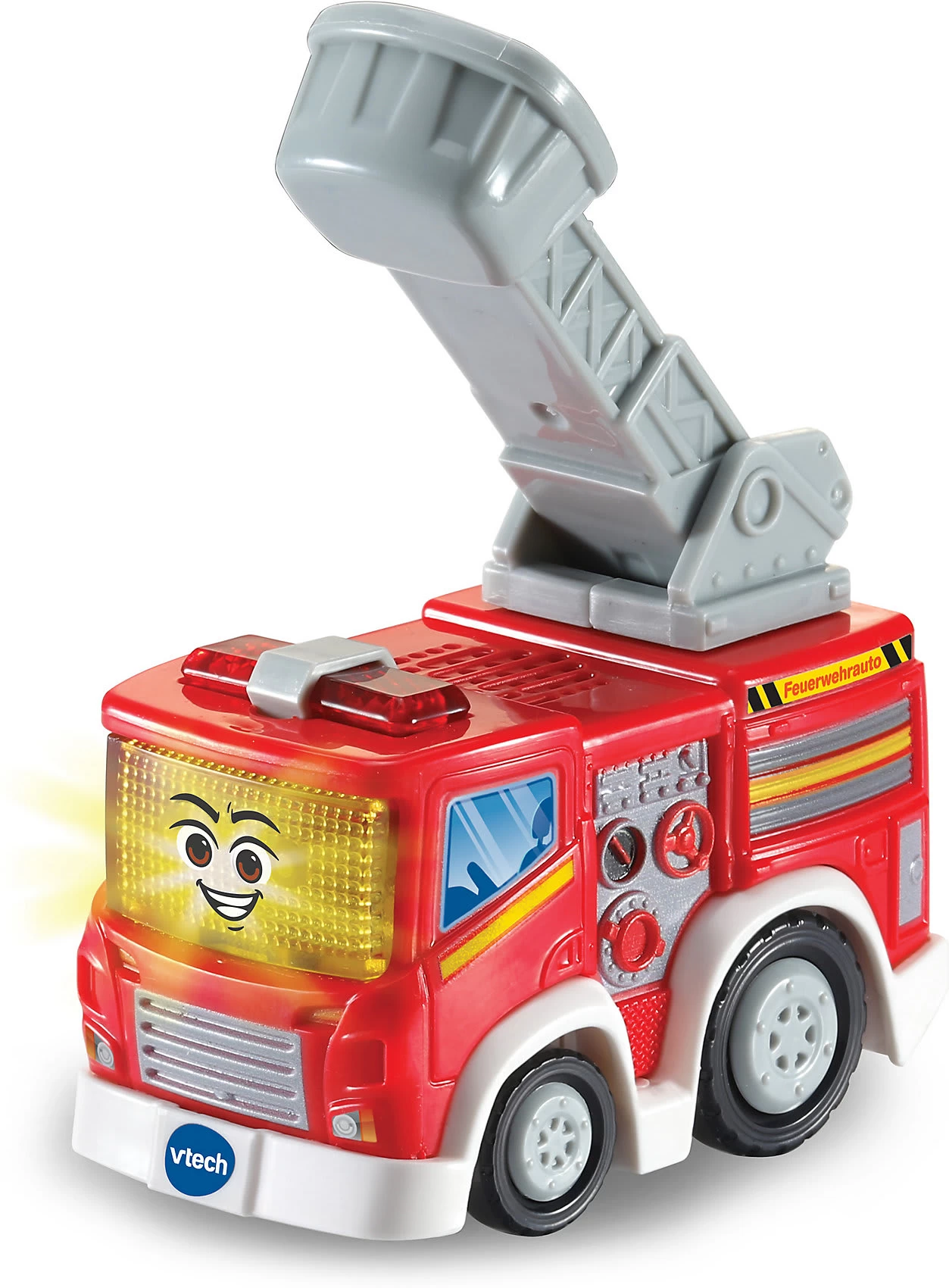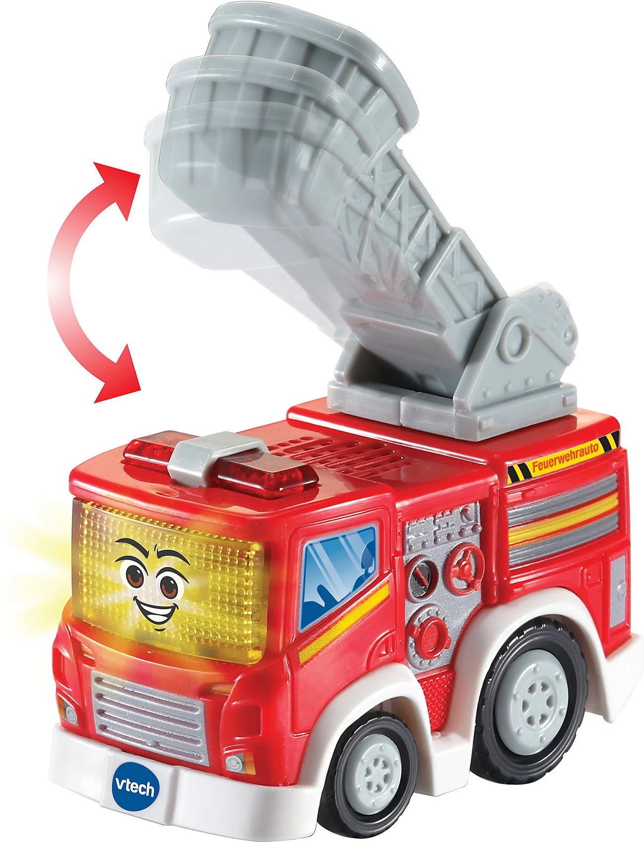 Hallo! Ich bin ein fleißiges Feuerwehrauto! Das Tut Tut Speedy Flitzer Feuerwehrauto von Vtech spricht fröhliche Sätze, spielt kindgerechte Melodien und Lieder und macht lustige Geräusche. Das Feuerwehrauto überzeugt mit dem detailgetreuen Design: Es lassen sich der Kühlergrill, die Radkappen sowie die detailreiche Seitenwand entdecken. Auf der hinteren Seite sind eine Leiter und Türen zu sehen (als Abbildungen). Die große Leiter verfügt über einen Korb zum Auf- und Abbewegen. Der Flitzer reagiert auf Bewegung der Räder. Er kann auch auf die magischen Sensoren der Tut Tut Baby Flitzer Spielsets reagieren (separat erhältlich).