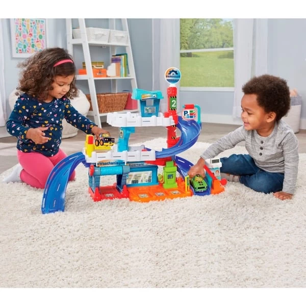 Auf geht die rasante Fahrt durch das Parkhaus! Großes, realistisch gestaltetes Parkhaus auf 3. Etagen zur Förderung der Motorik und des Rollenspiels. 2 große Rampen für rasanten Flitzerspaß. Realistisches Design durch bewusste Farbgebung der Straßen und des Parkhauses. 6 auffallend bebilderte magische Sensoren lösen bei den Tut Tut Baby Flitzern lustige Sätze, Melodien, Lieder und Geräusche aus. Die großen Abbildungen auf den magischen Sensoren geben einen Anhaltspunkt, was für Sätze, Geräusche etc. bei den Flitzern ausgelöst werden. Zahlreiche realistische, interaktive Elemente, die durch Aktionstasten in Bewegung gesetzt werden und bei den Flitzern realistische Geräuscheffekte auslösen: Autowaschanlage mit drehbarer Reinigungsbürste. Hebebühne, um die Flitzer auf und ab zu bewegen. Tuning-Station lässt den Flitzer vibrieren. Tankstelle mit änderbarer Tankanzeige. Bewegliches Parkschild und 2 Schranken. Stabiles Tut Tut Baby Flitzer Spielset mit Tut Tut Baby Flitzer – Rennauto.